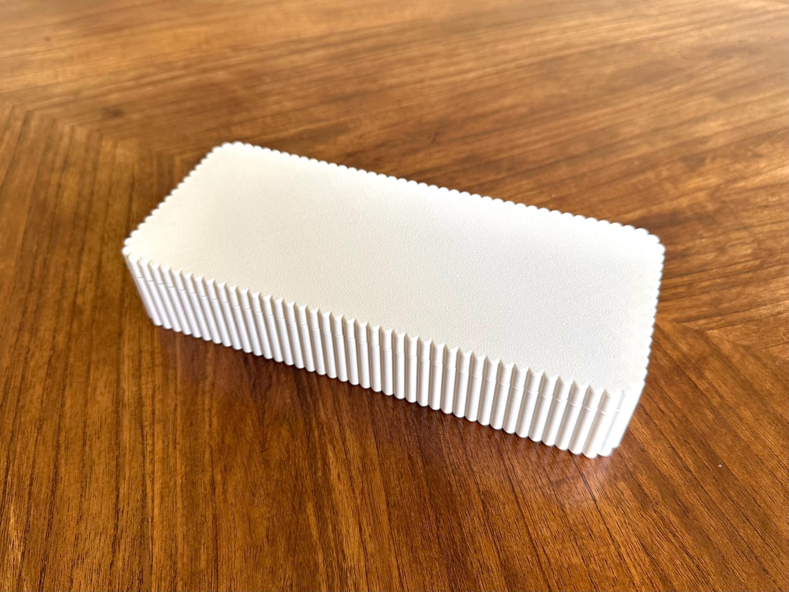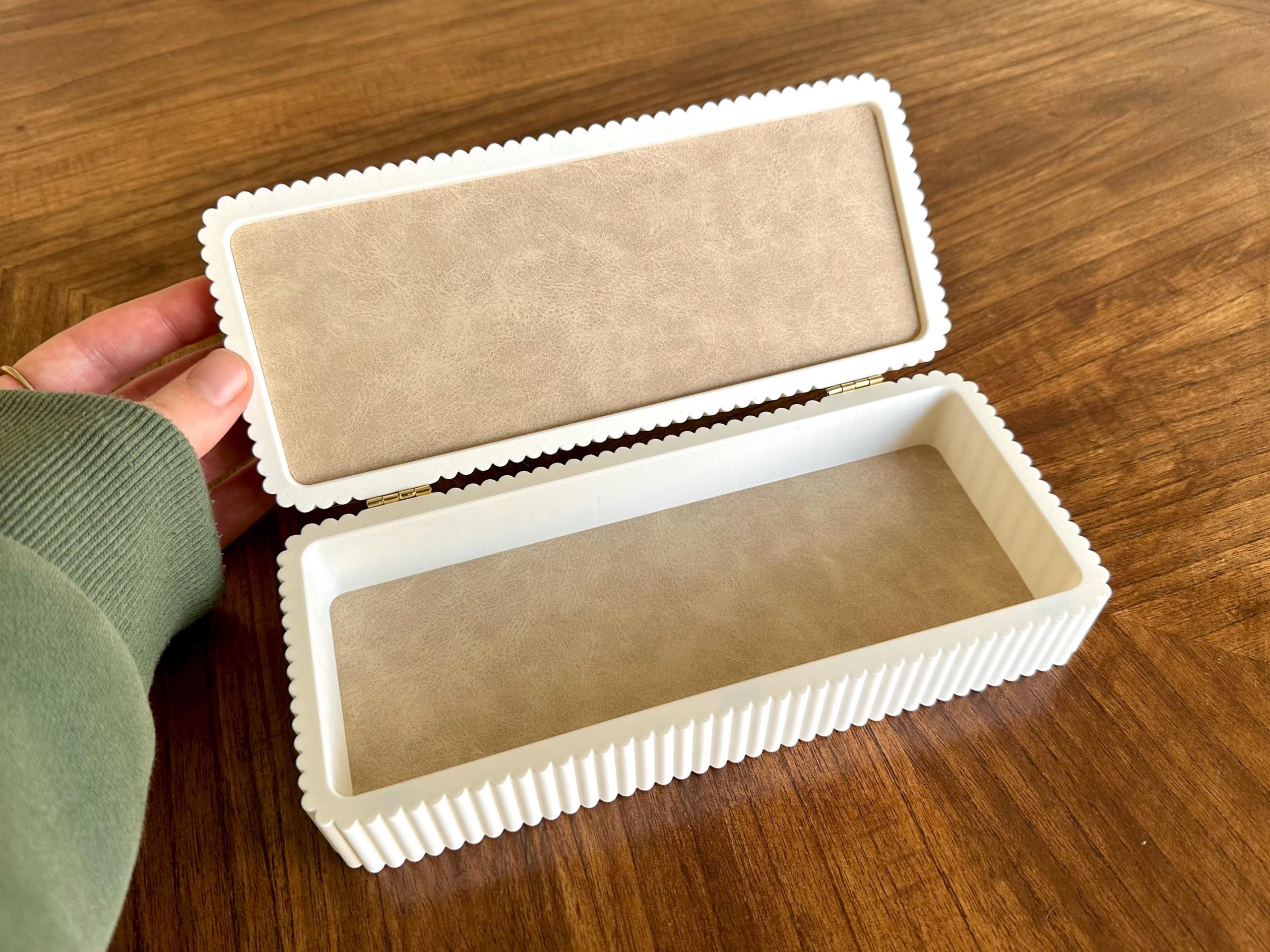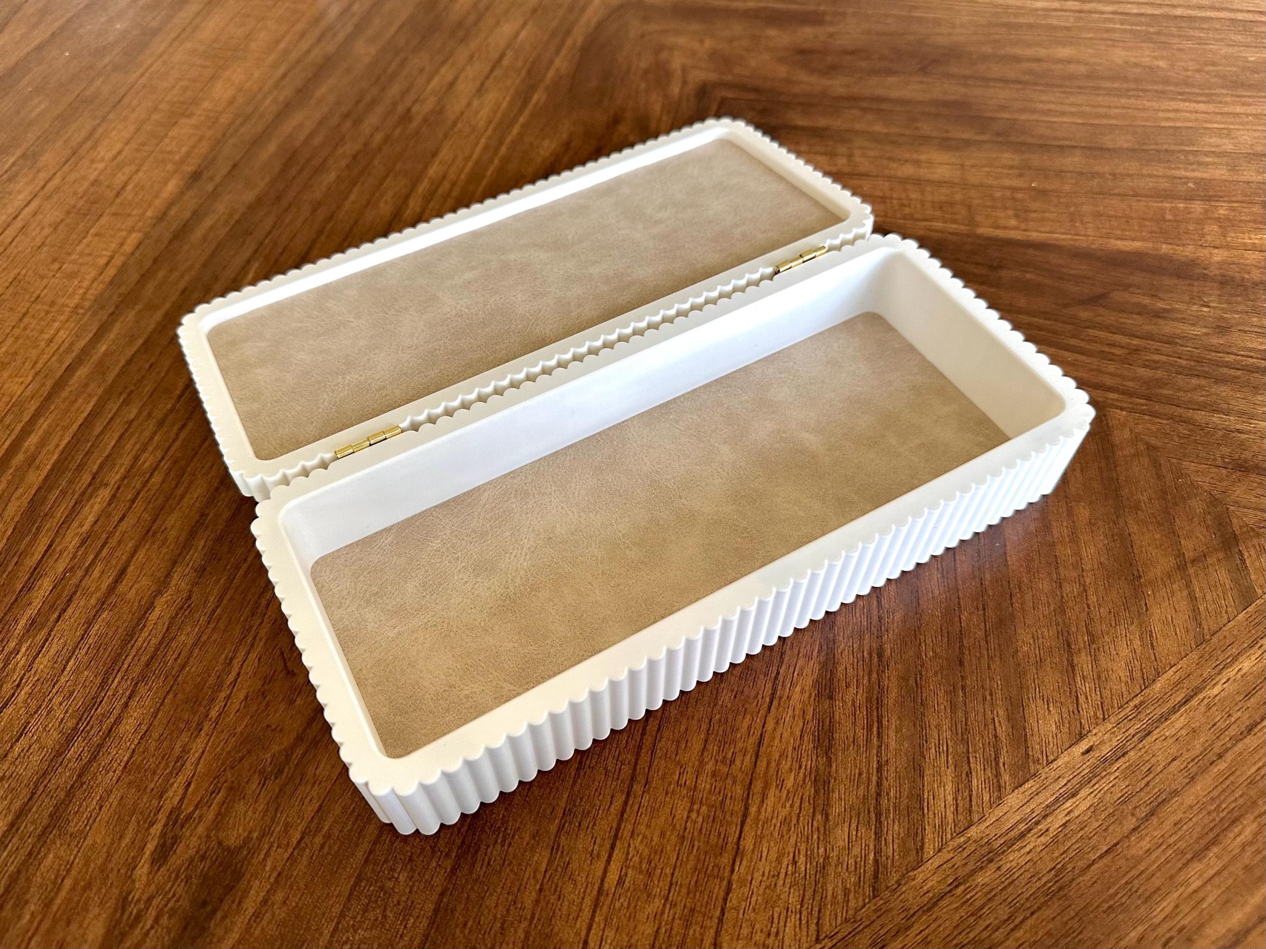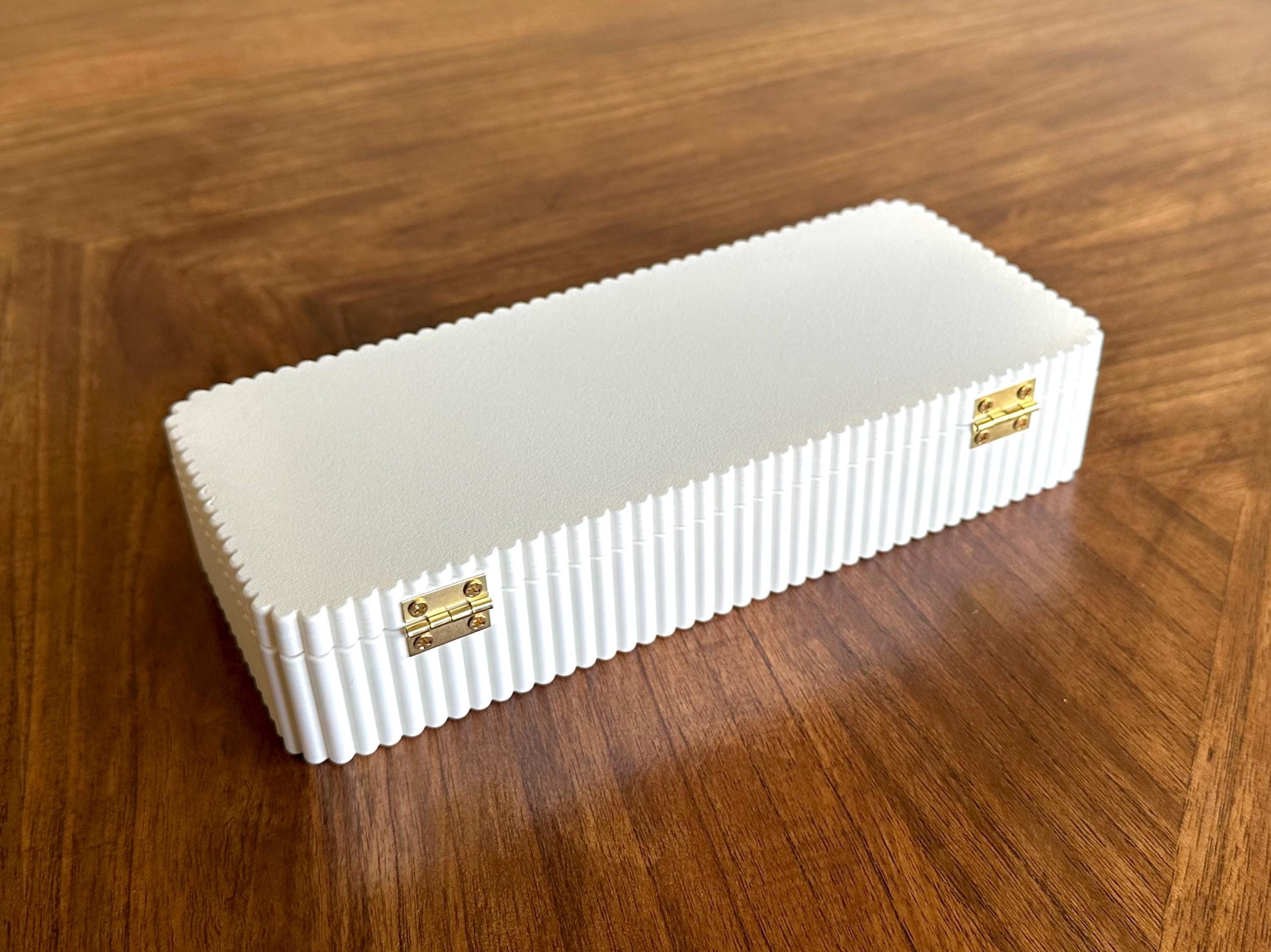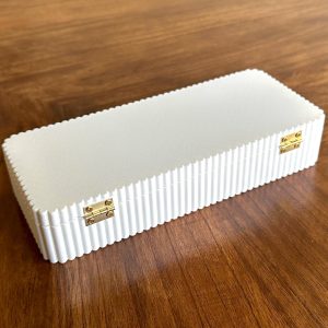 Fluted storage box designed for organizing pens, jewelry, keepsakes, or small items. Features a clean, modern form with a smooth finish, soft-lined interior, magnetic closure, and hinged lid for easy access. Suitable for everyday storage or as a thoughtful gift.