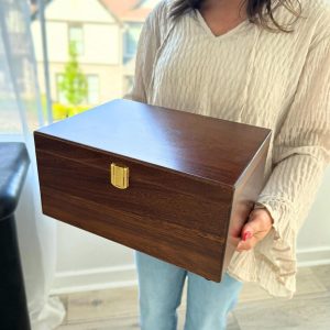 Wooden keepsake box designed for organizing jewelry, letters, photos, documents, and small items. Features a secure latch closure, hinged lid with hold-open support, and a snug-fitting design for safe storage. The smooth finish and natural grain provide a clean, refined look suitable for home, office, or decorative use. Offers a spacious and practical solution for everyday organization or meaningful storage.